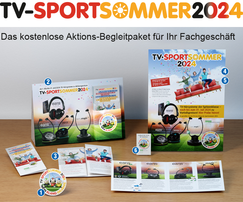 Im Zusammenhang mit Ihrer Bestellung von Aktions-TV-Hörsystemen, können Sie die kostenlosen begleitenden Informations-, Präsentations- und Werbemittel zur Aktion »TV-Sportsommer 2024« in Ihrer Auswahl und in Ihren Stückzahlen bestellen.