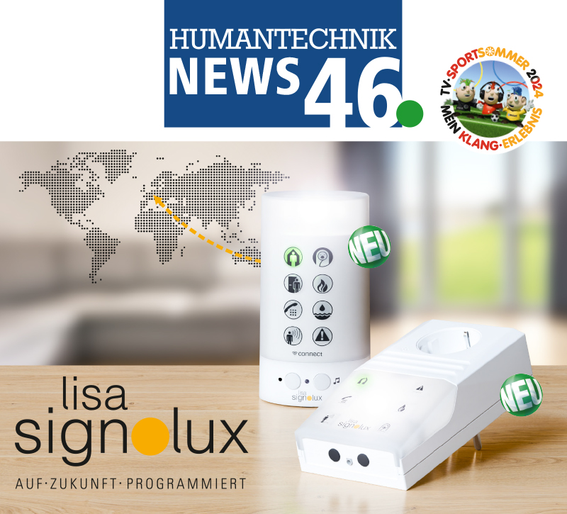 Liebe Geschäftspartnerin, lieber Geschäftspartner, mit dieser Ausgabe der Humantechnik News möchte ich Ihnen ein Überblick über die aktuellen Neuheiten in unserem Portfolio informieren – allen voran »earisMAX« unser neues Bluetooth® Auracast™ Kopfhörer-System. »lisa-signolux« goes Internet: Der neue Empfänger mit »connect« Funktion öffnet als Schnittstelle zu öffentlichen Mobilfunknetzen erweiterte Möglichkeiten der Erreichbarkeit von Meldungen der häuslichen Signalanlage »lisa-signolux«. Um bei »lisa-signolux« zu bleiben: Die Blitzlampe mit integrierter Schuko-Steckdose ist ab sofort verfügbar. Diese Themen und mehr behandelt unsere E-Mail-Ausgabe der Humantechnik News 46. Wir möchten Sie inspirieren – nicht zuletzt auch mit unserer Aktion »TV-Sportsommer 2024«. Herzliche Grüße