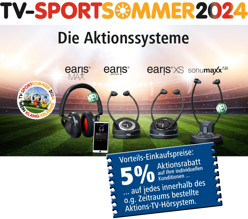 Aktion: »TV-Sportsommer 2024« – Vorteils-EinkaufspreiseUnvergessliche TV-Event-Audio-Erlebnisse für Ihre Kundinnen und KundenDie Humantechnik beteiligt sich mit einem Aktions-Einkaufsrabatt an Ihrer Preisgestaltung der Fachgeschäfts-Aktion »TV-Sportsommer 2024«. Vorteils-Einkaufspreise vom 1. Mai bis zum 31. Juli 2024 für unsere Top-TV-Hörsysteme »earis premium«, »earis-XS«, »sonumaxx 2.4« und »earisMAX«.
